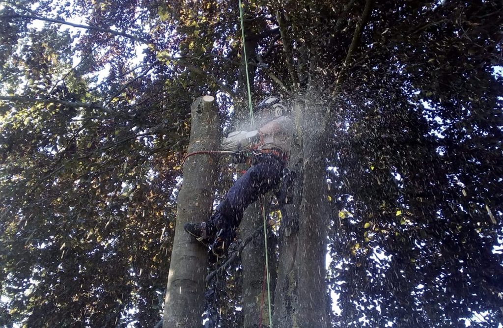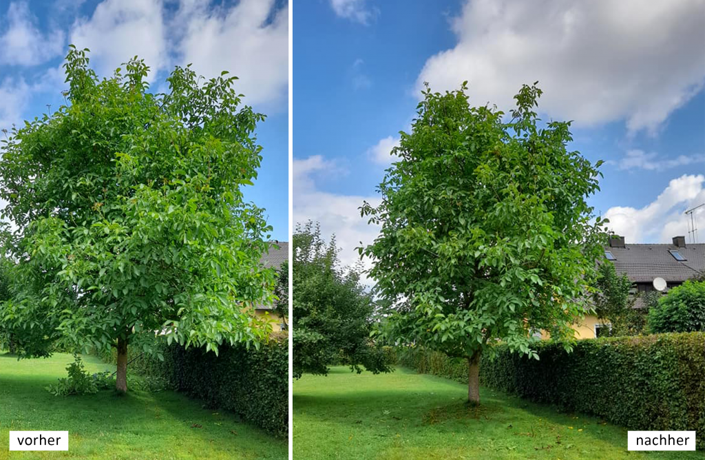 Hier werden die Bäume auf den sogenannten lichten Raum aufgeastet – neben Straßen bedeutet das 4,5 m und neben Gehwegen 2,5 m. Dies ist sehr wichtig, um Verkehrsunfälle und Schäden an den Bäumen zu vermeiden.